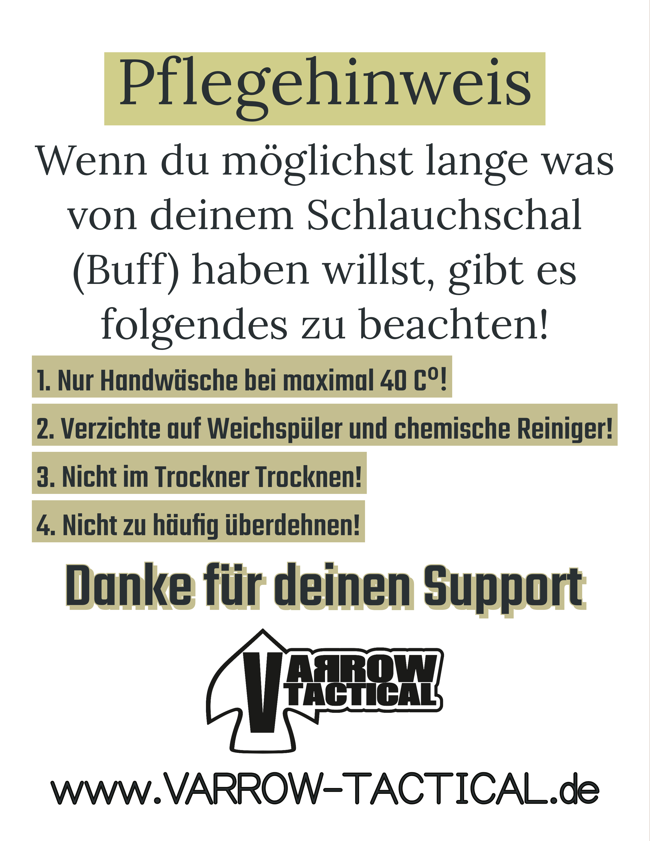 Leichter Polyester Schlauchschal mit VARROW TACTICAL LOGO, wie VARROW TACTICAL WAPPEN und Schriftzug als schwarzen oder floureszierenden (Nachtleuchtend) Flexdruck.